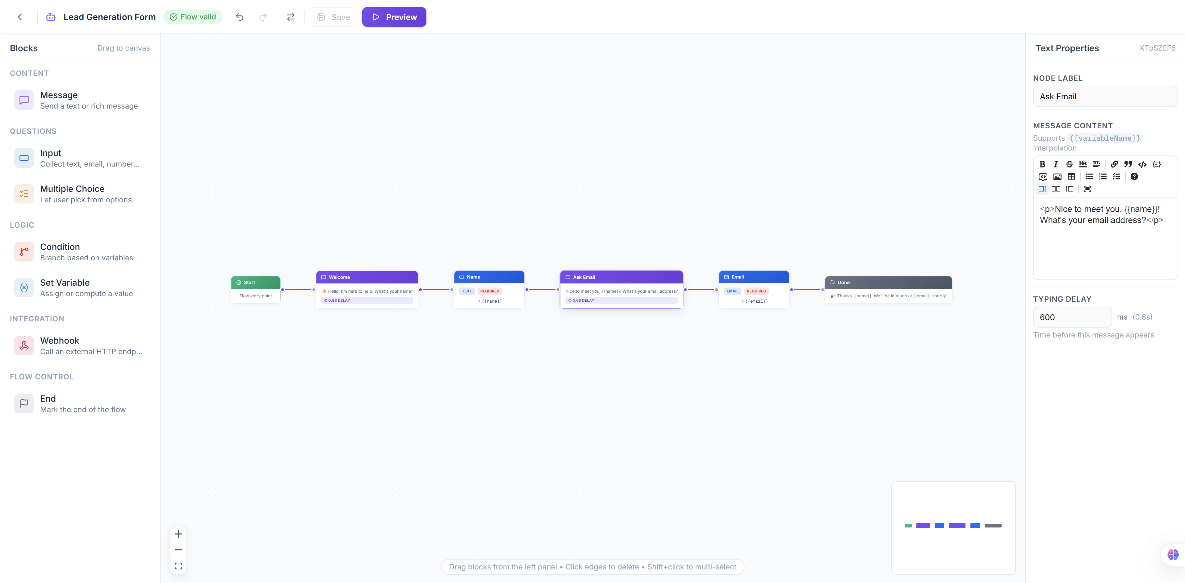 In modern conversational AI, bots are often used for lead generation. Bot Weave includes out-of-the-box templates and node concepts that showcase how to hook into CRM logic, validate emails, and securely capture lead intelligence throughout the flow.
